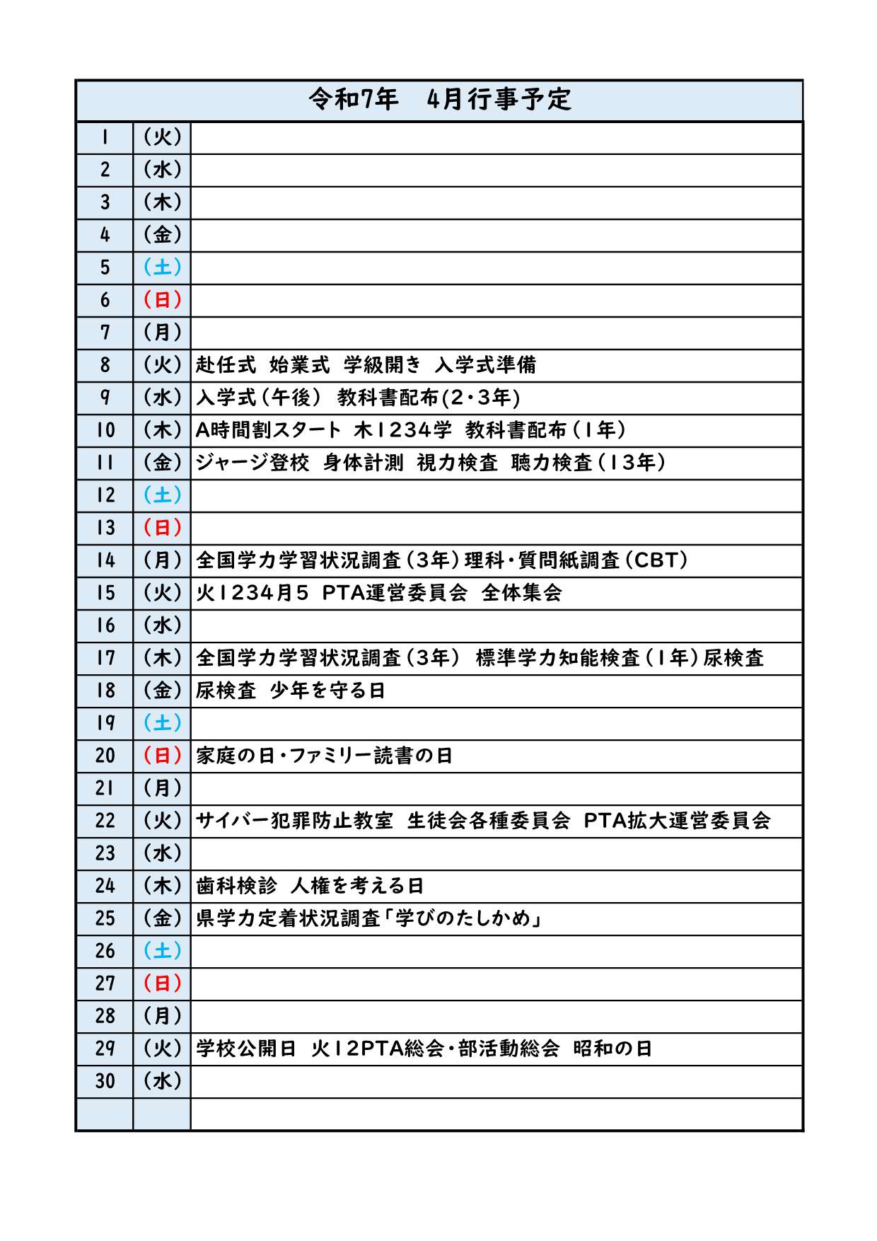 2025 3/21 令和7年度年間行事予定表を掲載しました